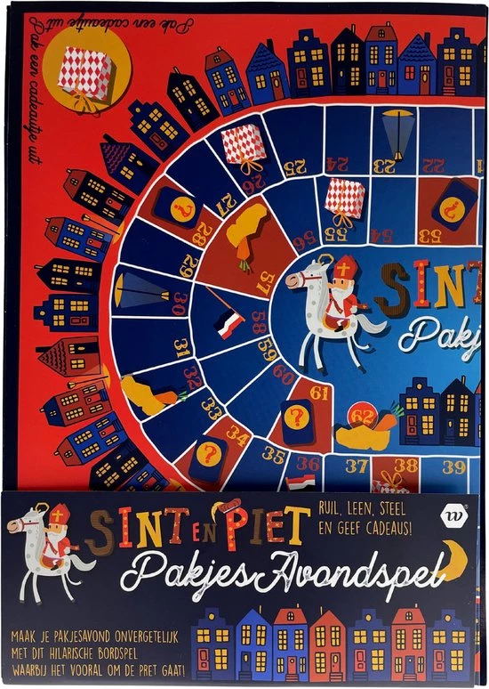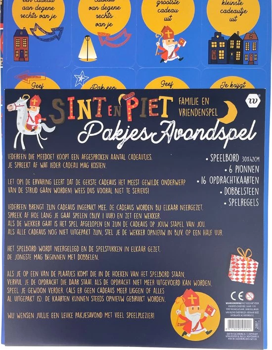 Dit leuke Sinterklaasspel is ideaal als familie en vriendenspel op Pakjesavond. Het Sinterklaasspel bestaat uit een speelbord, 6 pionnen, 16 opdrachtkaarten en de spelregels. Het werkt eenvoudig: iedereen koopt een aantal cadeautjes en neemt deze mee. Alle cadeautjes zijn ingepakt en worden bij elkaar neergezet. Spreek vervolgens een speeltijd af, bijvoorbeeld 60minuten en zet een timer op telefoon of gebruik een eierwekker. Speel het spel door de opdrachten uit te voeren van de opdrachtkaarten (bijvoorbeeld: geef een cadeau aan diegene rechts van je, pak het grootste cadeau uit, ruil een cadeau met je rechterbuur of ruil al je cadeaus met je linkerbuur. Gaat de timer of eierwekker af? Alle cadeaus die nog over zijn en op jouw stapel liggen zijn dan van jou!