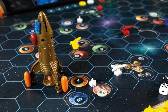 | Verpakkingsinhoud | Inhoud:, 4, grote, moederschepen, 24, boordkanonnen, 24, aandrijvingen, 20, vrachtmodulen, 28, gekleurde, kogels, 6, speelvelddelen, 16, ruimtekwadranten, 4, pionnen, 40, halve, medailles, 36, getallenfiches, 16, speciale, fiches, 100, grondstoffenkaarten, 32, ontmoetingskaarten, 20, vriendschapskaarten, 12, overzichtskaarten, 92, speelstukken, 2, dobbelstenen, 2, speelmateriaalhouders, 1, stickervel, De, spelregels, De, almanak, 11, plastic, zakjes> |