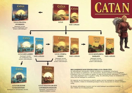 Scenario”s voor Catan met Zeevaarders. Ter gelegenheid van het bijna 20 jaar bestaan van Zeevaarders van Catan verschijnt deze speciale uitbreiding met 4 scenario”s. Deze zijn in verhaalvorm gegoten en geeft je informatie over de herkomst van de in Zeevaarders zo impopulaire zeerover. Je kunt de scenario”s in volgorde spelen en zo als het ware een campagne doorlopen. Daarbij ontvang je voordelen voor volgende scenario”s. Maar je kunt er ook voor kiezen om een scenario los te spelen. Om deze uitbreiding te kunnen spelen, moet je over het basisspel “Catan” en de uitbreiding “Zeevaarders” beschikken. Deze uitbreidingsset is uitsluitend te combineren met de nieuwste editie van het basisspel en de uitbreidingen (de editie uit 2012 met de plastic onderdelen). Zie hieronder de spelregels om de uitbreiding Catan: De Legende van de Zeerovers met andere uitbreidingen te spelen. Combinatie: Catan Legende van de Zeerovers met Catan Steden & Ridders