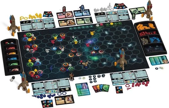 | Verpakkingsinhoud | Inhoud:, 3, ruimtekwadranten, 10, getallenfiches, 4, speciale, fiches, 2, reserve-getallenfiches, 1, vriendschapspion, 2, cockpitpionnen, 20, halve, medailles, 40, grondstofkaarten, 5, vriendschapskaarten, 14, overzichtskaarten, 46, speelstukken, in, 2, kleuren, 2, x, moederschip, Gekleurde, kogels, Vrachtmodule, 8, x, Boorkanon, 8, x, Aandrijving, 8, x, Vel, met, stickers, 5, plastic, zakjes, De, spelregels |