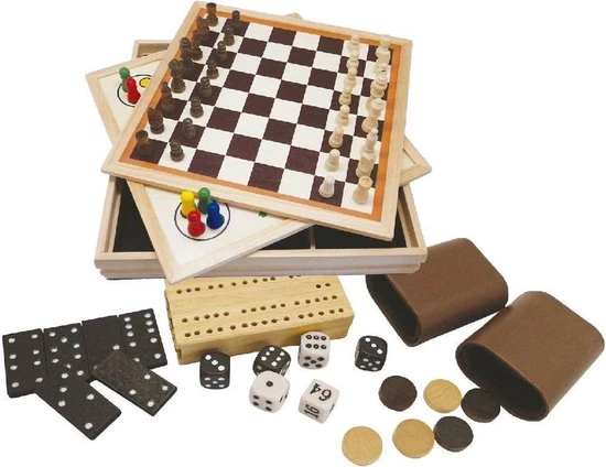 | Verpakkingsinhoud | 9, spellen:, schaken, dammen, backgammon, domino, ludo, dobbelspel, Cribbage, Morris, en, speelkaarten., Dit, is, echt, een, super-complete, set!, Inhoud:, 32, schaakstukken, 30, damstenen, 2, x, dubbelzijdig, geprint, bord, 6, backgammon, dobbelstenen, 28, domino, stenen, 16, ludo, pionnen, Cribbage, bord, met, 4, pinnen, 54, speelkaarten, en, 2, dobbelbekers. |