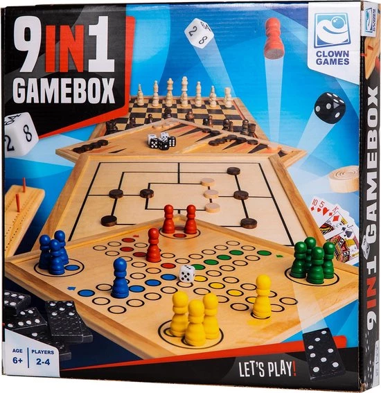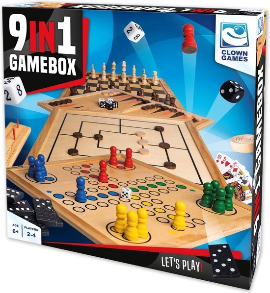 Clown Games 9-in-1 spellendoos van hout. Deze set bevat 9 spellen: schaken, dammen, backgammon, domino, ludo, dobbelspel, Cribbage, Morris en speelkaarten. Dit is echt een super-complete set! Inhoud: 32 schaakstukken, 30 damstenen, 2 x dubbelzijdig geprint bord, 6 backgammon dobbelstenen, 28 domino stenen, 16 ludo pionnen, Cribbage bord met 4 pinnen, 54 speelkaarten en 2 dobbelbekers. Je kunt alle spelonderdelen opruimen in een handige opbergdoos met vakken, voorzien van een vilten onderkant. Afmetingen van deze opbergdoos: 35 x 35 x 6 cm. Op clowngames.nl is een uitgebreide handleiding in 6 talen te vinden. Wordt geleverd in full-colour doos. Geschikt voor zowel kinderen als volwassenen: 2 tot 4 spelers vanaf 6 jaar.