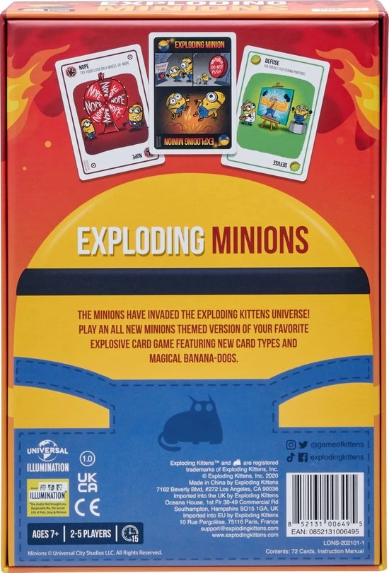 De makes van Exploding Kittens hebben uitgebreid en introduceren Exploding Minions! De Minions die bekend zijn van de Verschikkelijke Ikke en Minions films mogen ook deelnemen aan het russische roulette kaartspel! Net als bij Exploding Kittens is het doel bij Exploding Minions om niet te ontploffen dankzij een Exploding Minion-kaart. Heb je een Defuse kaart, dan ben je veilig voor de Exploding Minion. Met de andere kaarten die je in de hand hebt, moet je er alles aan doen om de Exploding Minion.