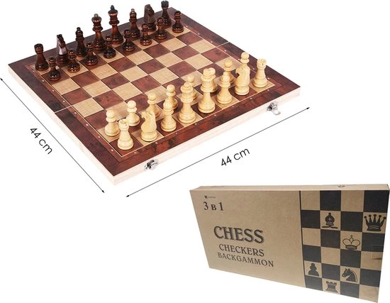 Het Schaakbord Hout is 44 bij 44 cm. Met de 2 sluitingen klik je het bord stevig dicht. Je pionnen passen er allemaal in. Ideaal om mee te nemen als je buiten de deur gaat spelen dus! De set is gemaakt van stevig, waterbestendig hout. Hij gaat dus vele potjes mee.