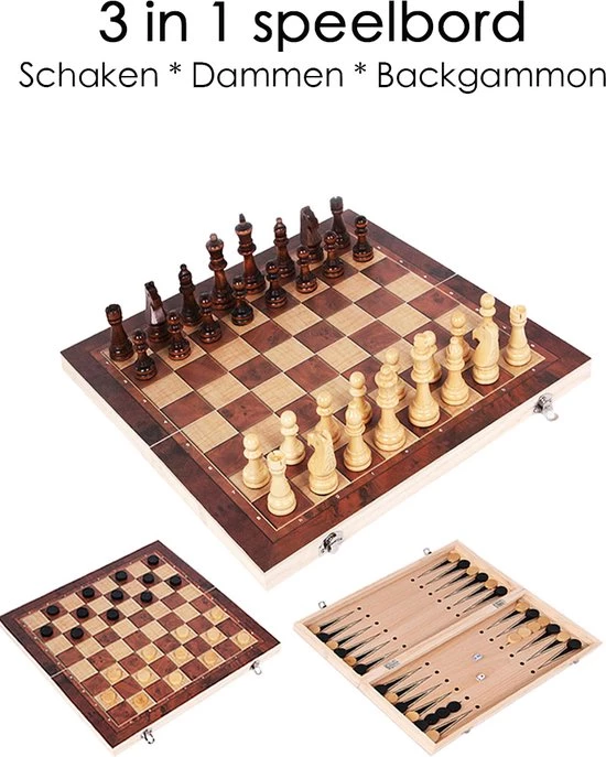 Met het Schaakbord Hout hoef je je nooit te vervelen. Met dit bord kun je schaken, dammen ?n backgammon spelen. Dit schaakboard heeft een mooie en hoogwaardige uitstraling. Hierdoor staat het ook erg mooi in ieder interieur.