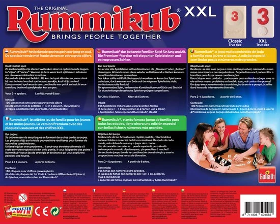 Het bekende Rummikub maar dan met extra grote stenen en plankjes. Rummikub XXL is zeer geschikt voor personen die minder goed kunnen zien. Maak mooie cijferreeksen met de gekleurde cijfers op je plankje. Wie legt de slimste combinaties? Ben jij degene die het eerst alle cijfers op tafel heeft liggen? Een spel dat inzicht, durf en tactiek combineert. Rummikub The Original XXL kan je al spelen vanaf 6 jaar, waardoor iedereen mee kan doen!