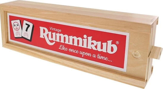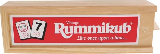 Rummikub Vintage is de chique, nostalgische uitvoering van het bekende spel. Rummikub wordt al decennialang gespeeld en deze uitvoering is bij veel spelers favoriet. De stenen zijn van urea, dat is een verzwaarde kunststof en ze liggen lekker in de hand. Het materiaal wordt opgeborgen in een handig, houten kistje. Echt een handig kistje, want de vier zijden gebruik je als rekje.