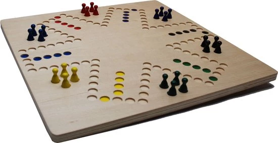 Houten Speelbord voor 2 tot 6 spelers. Het betreft een dubbelzijdig speelbord van blank gelakt multiplex 40×40 cm en is compleet met houten pionnen en 2 decks speelkaarten.