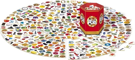 | Verpakkingsinhoud | 1, spelbord, 368, kaartjes, met, afbeeldingen, 1, vouwbaar, bakje, 18, fiches, spelregels |