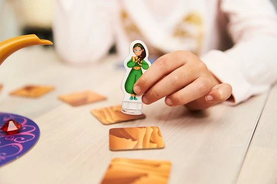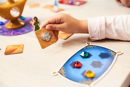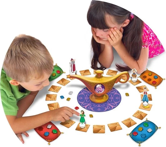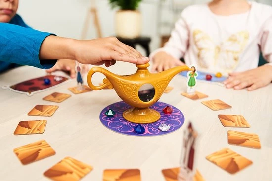 De boze tovenaar Mustafa is op zoek naar vijf magische edelstenen die verborgen zijn in de Arabische woestijn. Aladdin en prinses Amira zijn ook op zoek naar deze schatten. Als je aan de beurt bent, druk je op de Wonderlamp en luister je zorgvuldig naar het geluid dat volgt. Tel het aantal trommelslagen. Dit geeft je het aantal plaatsen die je vooruit mag met je speelstuk. Draai de kaart om, zodat je kunt zien wat je moet doen, en zet je speelfiguur erop. De eerste speler die alle edelstenen vindt, krijgt de controle over de Geest van de Lamp (en wint)!