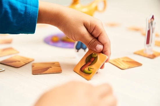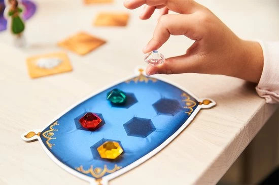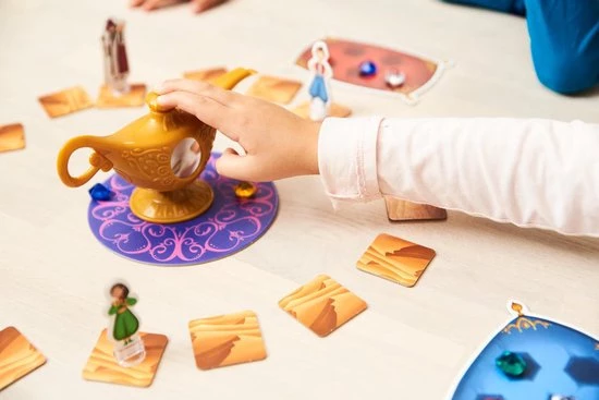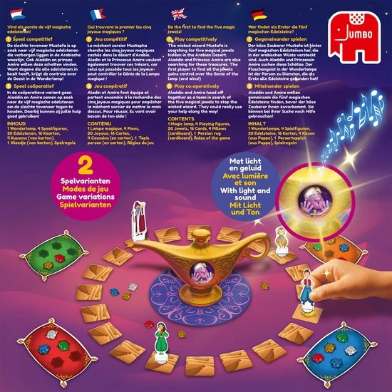 Aladdin en Amira starten samen als team op zoek naar de vijf magische edelstenen om de boze tovenaar te stoppen. Ze kunnen jouw help onderweg goed gebruiken! Druk op de Wonderlamp en luister zorgvuldig naar het geluid dat volgt. Tel het aantal trommelslagen. Dit geeft je het aantal plaatsen dat Aladdin of prinses Amira vooruit mag. Draai de kaart om, zodat je kunt zien wat je moet doen, en zet je speelfiguur erop. Wanneer je een gemene lach hoort, dan is het de beurt van Mustafa. Tel het aantal trommelslagen. Dit geeft je het aantal plaatsen dat Mustafa vooruit mag. Draai de kaart om, zodat je kunt zien wat Mustafa moet doen. Als de spelers erin slagen om alle vijf de verschillend gekleurde edelstenen te verzamelen voordat het Mustafa lukt, dan winnen zij het spel samen. Maar als Mustafa sneller is, dan verliezen de spelers het spel.