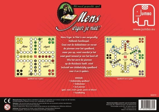 Het speelbord is tweezijdig bedrukt: een kant voor kleinere gezelschappen (totaal 4 spelers), de andere kant voor grotere (totaal 6 spelers). Er zijn verschillende versies van de spelletjes Mens Erger Je Niet, speel ze allemaal!