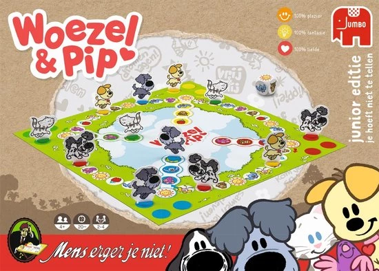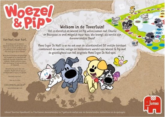 Mens Erger Je Niet Woezel en Pip is Mens Erger Je Niet speciaal ontworpen voor kinderen vanaf 4 jaar. In plaats van een dobbelsteen met ogen heeft dit spelletje dobbelstenen met figuren uit de tovertuin. Kinderen die nog niet kunnen tellen, kunnen hierdoor ook gezellig meedoen.