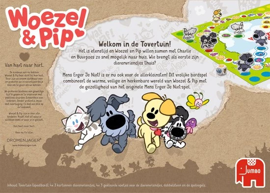 Het klassieke Jumbo Mens Erger Je Niet bordspel in een Woezel en Pip jasje! Het is etenstijd en Woezel en Pip willen samen met Charlie en Buurpoes zo snel mogelijk naar huis. Wie brengt als eerste zijn dierenvriendjes thuis? Mens Erger Je Niet Woezel en Pip brengt de favoriete vriendjes van jouw kleuter tot leven in het allerleukste bordspel voor kinderen!