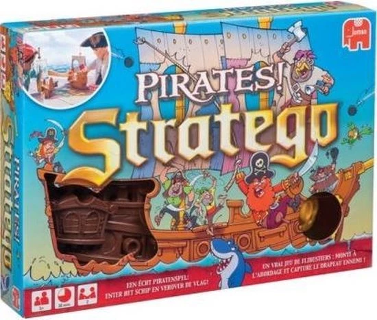 Stratego Pirates van Jumbo is een spel voor twee dappere piraten. Verover de vlag op het vijandelijke schip door het te enteren, te beschieten met het kanon, te vechten op het dek of een vijandelijke piraat aan de haaien te voeren. De Piraat die als eerste de vlag weet te veroveren, wint het spel en mag zich de slimste piraat van de zee noemen! Schip Ahoy!