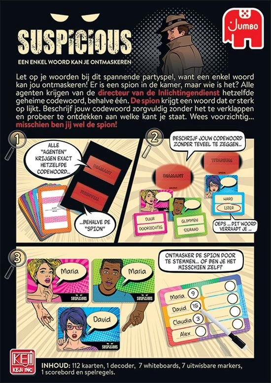 - Suspiscious wordt geleverd met 224 woordcombinaties voor vele avonden speelplezier!
