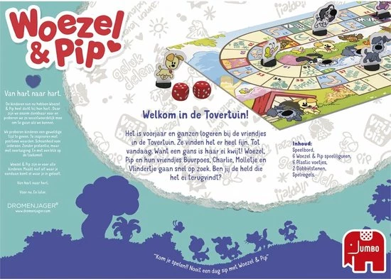 Oma speelt het, je betovergrootvader speelde het en jij speelt het. Het welbekende gezelschapsspel is er nu in een Woezel & Pip uitvoering. Het Jumbo Woezel & Pip Ganzenbord is geschikt voor kinderen vanaf 4 jaar. Speelbord met 6 Woezel en Pip speelfiguren, 6 plasticvoetjes, 2 dobbelstenen en Spelregels.