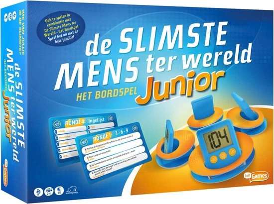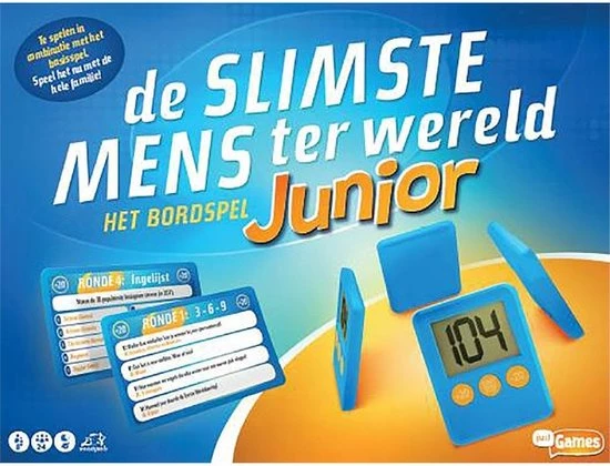 De Slimste Mens ter Wereld Junior is een superleuk bordspel, gebaseerd op de populaire TV-quiz. Speciaal voor de jonge spelers van acht jaar en ouder is er deze junior uitvoering. Deze uitvoering bevat vijf rondes met vragen. Speel je tegenspeler naar 0 seconden en kroon jezelf tot de jongste ?Slimste Mens ter Wereld?! Het is mogelijk om de junior versie van dit spel te combineren met de originele versie. Zo kan je hele familie meespelen.