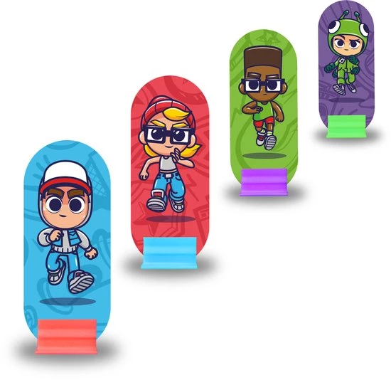 Ervaar de legendarische app nu als bordspel bij jou aan de huistafel! Daag elkaar uit met de favoriete personages uit de Subway Surfers-franchise zoals Jake, Tricky, Fresh en Yutani op de drie iconische spoorbanen. Vergroot je surfvaardigheden met items, verzamel munten en ontwijk tegemoetkomende treinen in dit behendige en avontuurlijke spel!