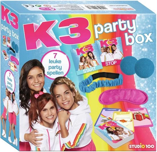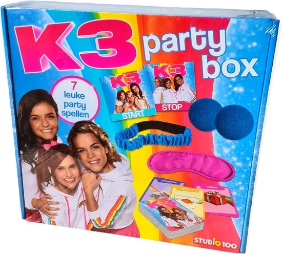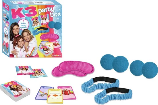 Wanneer de K3?tjes een feestje houden, spelen ze altijd leuke party spellen. In deze party box vind je alles om 7 leuke K3-spelletjes te spelen. Elk feestje wordt nog leuker met de favoriete spelletjes van Klaasje, Hanne en Marthe. Doe je mee? 3,2,1, start, het is tijd voor een feestje!