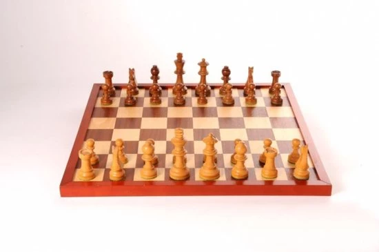 Dam- en schaakbord, ingelegd met hout en afgewerkt met luxe opstaande rand.