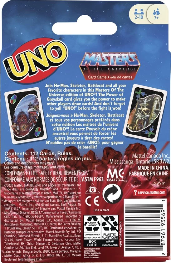 Het UNO kaartspel waar iedereen gek op is, krijgt een stoere look met He-Man™ and the Masters of the Universe. Naast dynamische afbeeldingen van MOTU personages, van sterke helden tot dodelijke tovenaars, geldt in deze versie ook een unieke regel: de Power of Greyskull kaart. Om deze kaart te gebruiken, moet de speler de kaart boven zijn of haar hoofd houden en zeggen: “By the power of Greyskull, ik heb de macht!!” Alle andere spelers moeten dan 3 kaarten trekken. Het spel gaat verder precies als het klassieke UNO: spelers moeten kaarten met hetzelfde cijfer of dezelfde kleur opleggen met als doel zo snel mogelijk al hun kaarten kwijt te raken. En vergeet vooral niet triomfantelijk “UNO” te roepen als je nog één kaart over hebt! Deze versie van het populaire kaartspel voor het hele gezin is een geweldig cadeau voor spelers vanaf 7 jaar, vooral voor fans van MOTU. Kleuren en versieringen kunnen variëren.