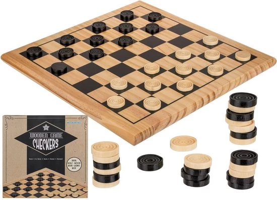 Houten damspel 28 x 28 cm. Houten damstukken met dambord in geschenkdoos. Het dambord heeft een afmeting van 28 x 28 cm. Dammen denkspel speelgoed voor kinderen en volwassenen.