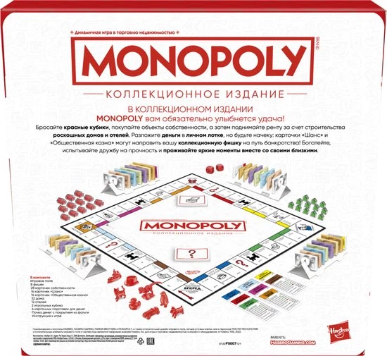Gooi de rode dobbelstenen om bezittingen te kopen en verhoog de huur met luxe huizen en hotels. Spelers kunnen het gelamineerde geld bewaren in hun eigen tray en zich over het bord verplaatsen met een van de 8 rood-emaille Monopolypionnen.