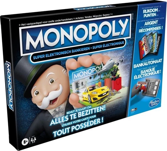 Het bordspel Monopoly Super Elektronisch Bankieren heeft een alles-in-??n elektronische bankautomaat en maakt het spel nog spannender met unieke beloningen! Elke speler heeft een bankpas waarmee je verschillende beloningen kunt verdienen wanneer je een bepaald getal gooit met de dobbelstenen, op een bepaald vakje belandt of een bepaalde eigendom koopt. Je kunt ook naar een andere eigendom op het spelbord vliegen en een andere speler ertoe verplichten een felbegeerde eigendom te ruilen. In dit spel is er geen contant geld, je geld wordt bijgehouden op de bankpassen en bankautomaat. Spelers kopen eigendommen, innen huur en worden ervoor beloond … Monopoly is spannender dan ooit! De winnaar is de speler met het meeste geld op het einde van het spel.