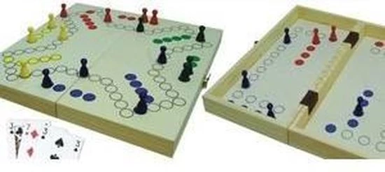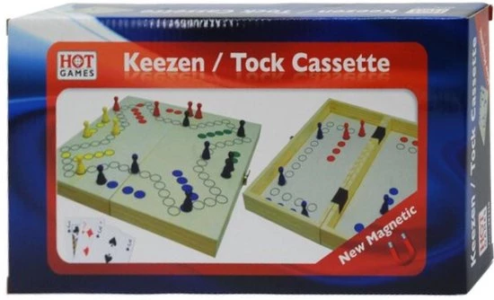 Keezen spel in opklapbare kist van 30 cm. Dit vouwbare bord heeft open een afmeting van 30 x 30 x 2.5 cm en gesloten is de afmeting 30 x 15 x 5 cm. Met aan de buitenzijde de uitvoering voor 4 spelers en aan de binnenkant de uitvoering voor 2 spelers. Bij dit Keezenspel zit 1 set speelkaarten en houten pionnen. Bij het Keezenspel doe je de zetten met speelkaarten.