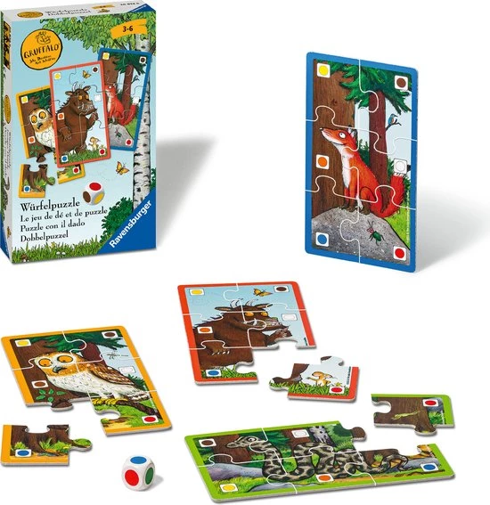 Spel- en dobbelplezier met de Gruffalo en de kleine muis! Met dobbelgeluk kun je iedere ronde een puzzelstuk verzamelen. Wie heeft zijn puzzel als eerste compleet?