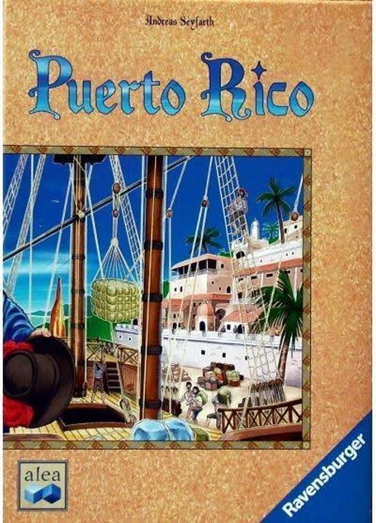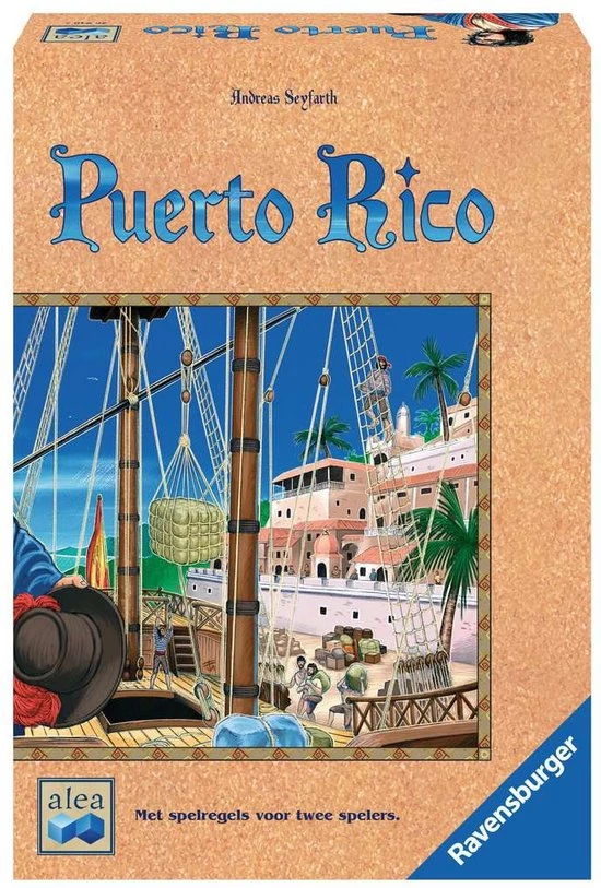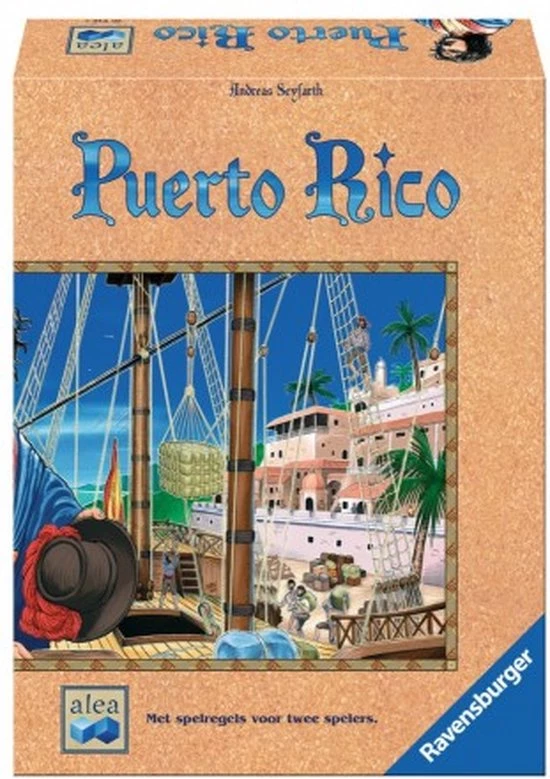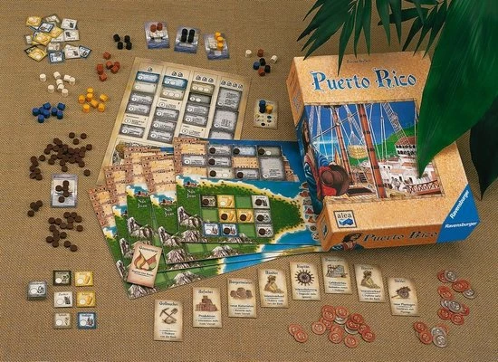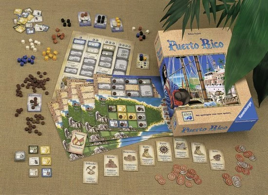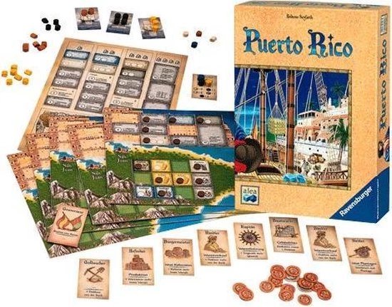 Dit is het Ravensburger bordspel Puerto Rico. In 1493 ontdekt Columbus Puerto Rico, de parel van het Caribische gebied. En al een goede halve eeuw later beleeft het eiland haar eerste grote bloeiperiode. De spelers kruipen tijdens het spel steeds weer in een andere rol. Als kolonist leggen ze vruchtbare plantages aan. Als opzichter produceren ze waardevolle goederen, die ze dan, in de rol van handelaar, met de hoogst mogelijke winst verkopen. Dat verdiende geld gebruiken ze dan weer om als bouwmeester indrukwekkende stadsgebouwen op te richten.