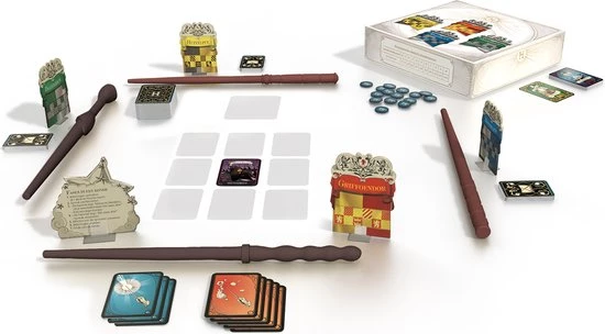 Inhoud: 1 spelbord, 8 toverstokken, 9 vlagtegels, 1 favoriet-tegel, 142 kaarten, 24 fiches, 10 plastic houders, spelregels