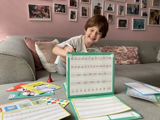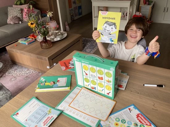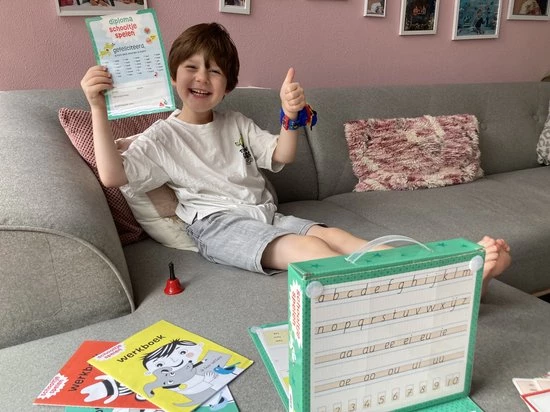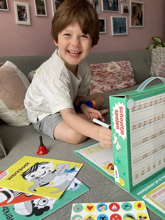 Thuis oefenen is een feest met schooltje spelen. Met de werkboeken, schoolbel, diploma, beloningsstickers, oefenkaarten en de uitwisbare stiften kruipen kinderen echt in de rol van juf of meester. Sluit 100% aan bij school. Een ware bestseller.