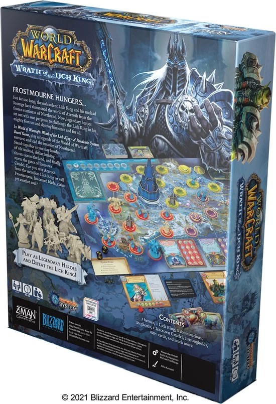 In dit epische avontuur uit het World of Warcraft-universum reizen spelers naar het bevroren continent Northrend om het op te nemen tegen de legers van de Lich King. Deze Pandemic System-game toont bekende mechanica en gameplay, nu aangepast om de setting van de Wrath of the Lich King te omarmen. Forten, tempels, slagvelden en meer bevolken het spelbord terwijl jij en je medehelden door het koude landschap reizen. Onderweg zet je forten op, voltooi je missies en vecht je met legioenen ondoden.
