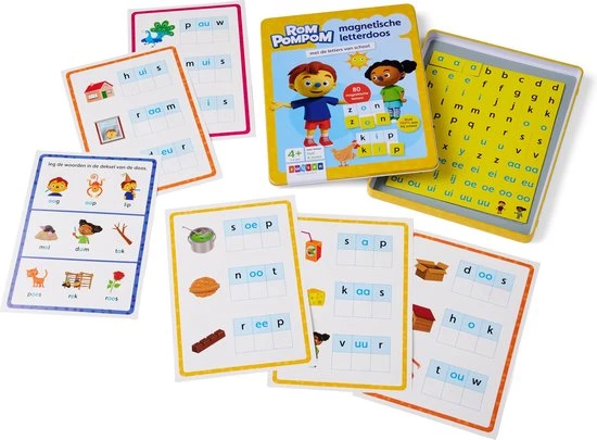 Kleuters maken op school kennis met letters. Met deze oude vertrouwde letterdoos (in een nieuw en handzamer jasje!) kunnen hun kinderen hun eigen naam opzoeken en zelf woordjes leggen. Kinderen leggen een werkblad in de deksel van de letterdoos. Vervolgens leggen ze de magneetjes op het gekozen werkblad. Eindeloos speelplezier met Pompom, hét vriendje van school.