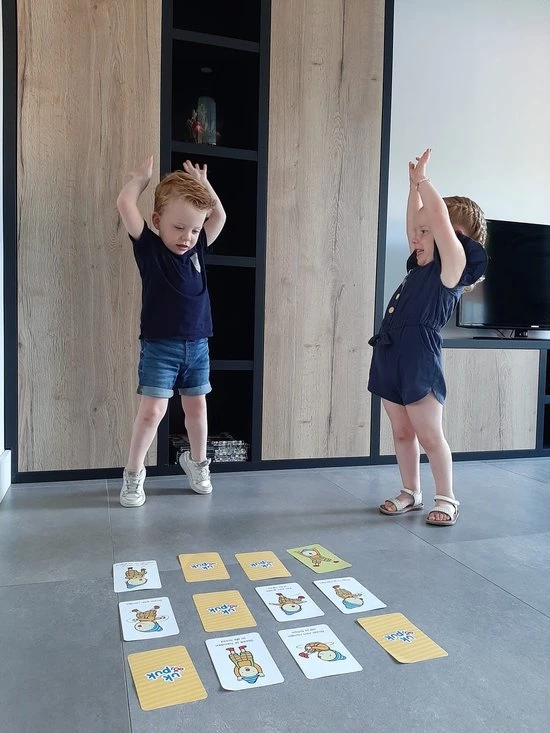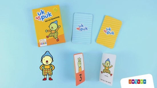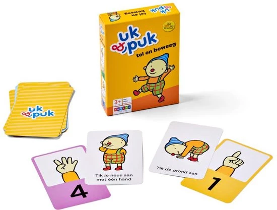 Leren tellen en bewegen tegelijk! Dat kan met dit spel met telkaartjes van 1 tot en met 10 en kaartjes met beweegopdrachten. Samen met Puk doen kinderen leuke opdrachten, zoals tien tellen op één been staan, drie keer een rondje draaien en vijf keer in de lucht springen. Een kind kan dit spel alleen spelen, maar ook met andere kinderen. En het is natuurlijk extra leuk om als volwassene ook mee te bewegen!